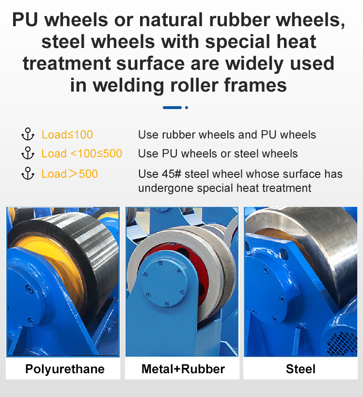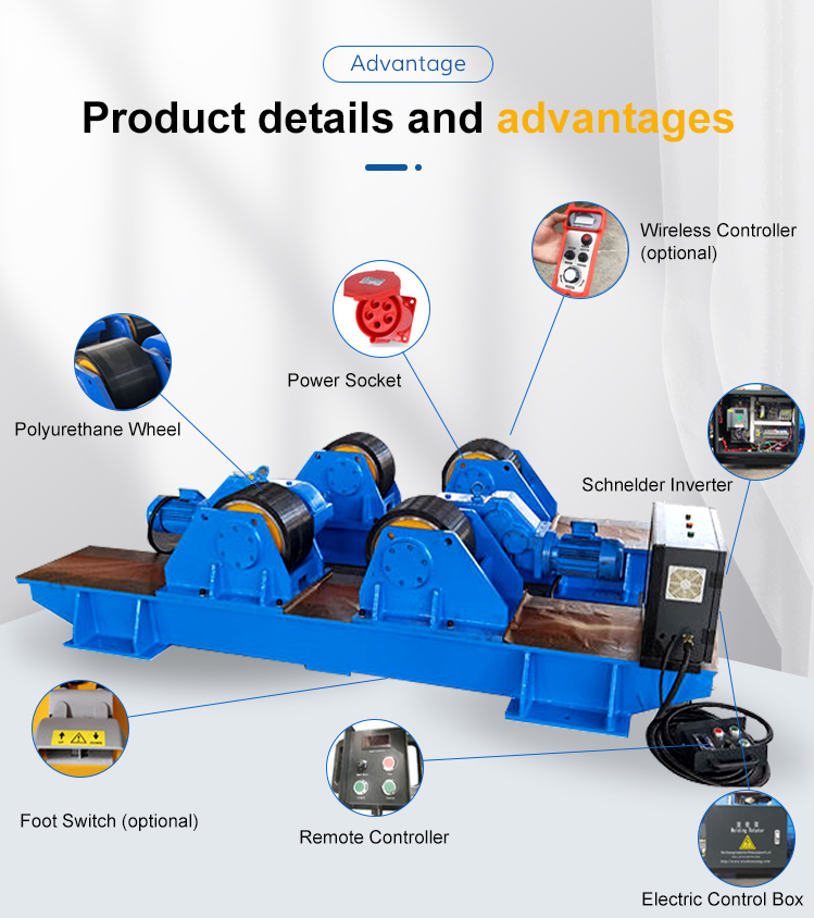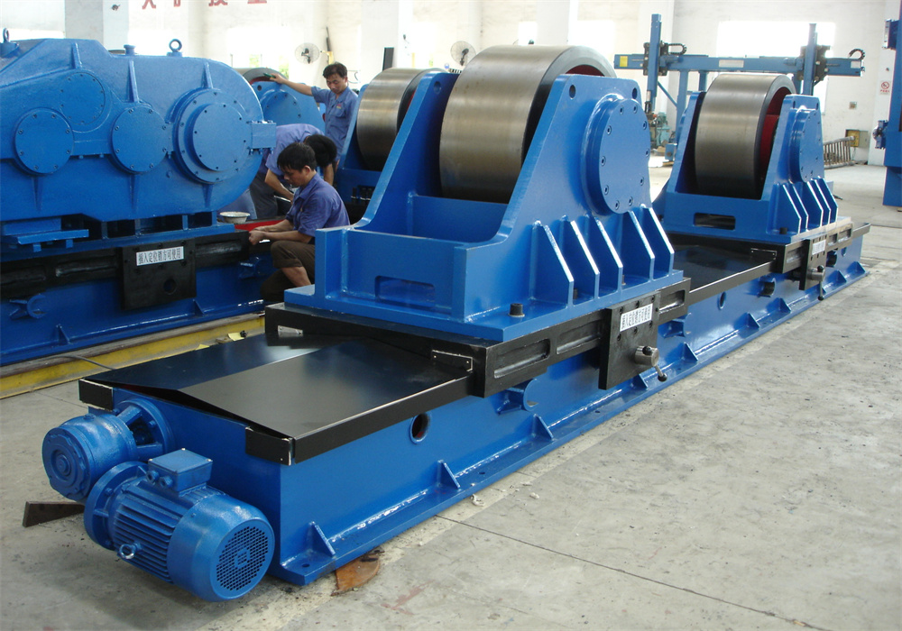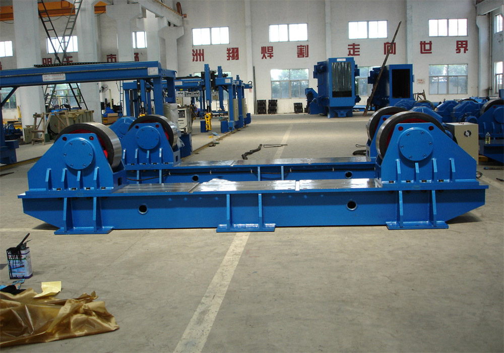 This adjustable welding rotator consists of lead screw adjustable type and bolt adjustable type. It is used for welding of round cylinders. By moving the roller groups according to different diameters of work-piece, the center distance can be adjusted to suit for the work-piece with diameters. The adjustable welding rotator consists of powered rotator, idle rotator, driving reducer system and control system etc.