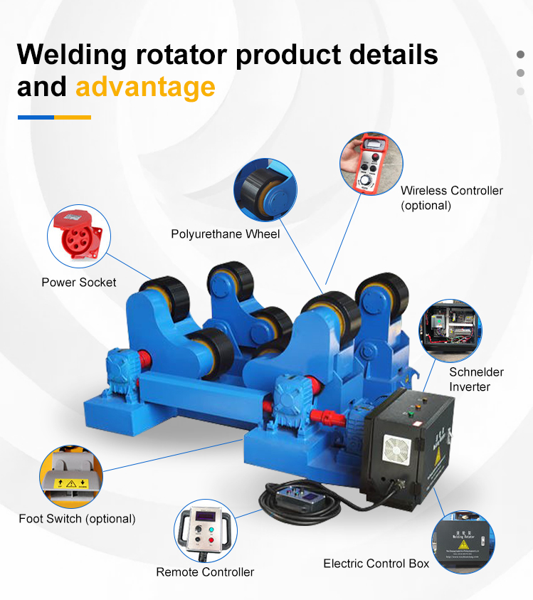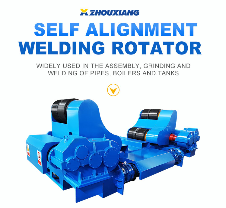 Self-aligned welding rotator includes one power and one idle, after loading the work piece, the rollers will auto suit the work piece, no need to adjust the center distance. This welding rotator mainly consists of powered rotator, idle rotator, driving reducer system, control system etc. It is mainly used for longitudinal and circular seam welding of cylinders together with the submerged arc welder.